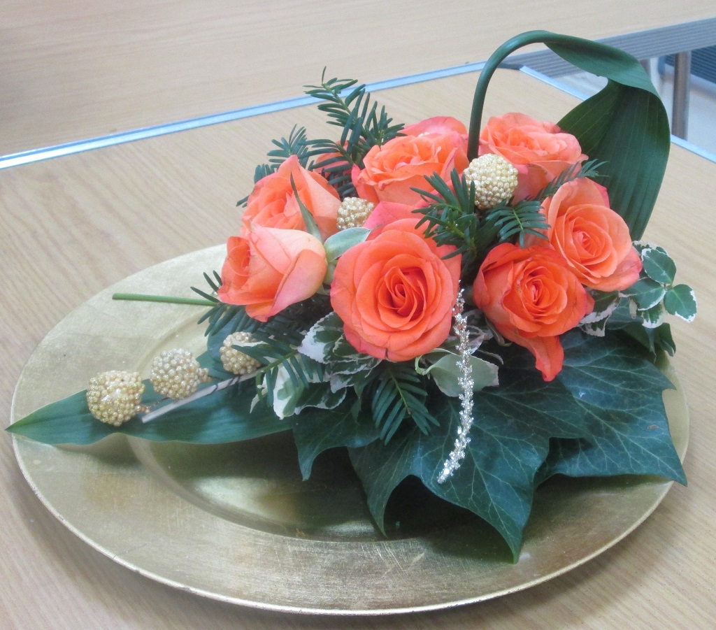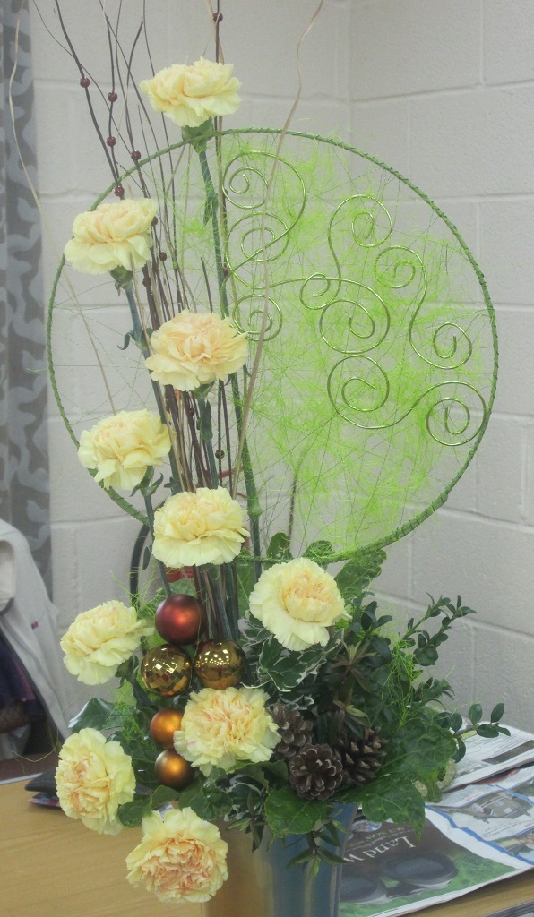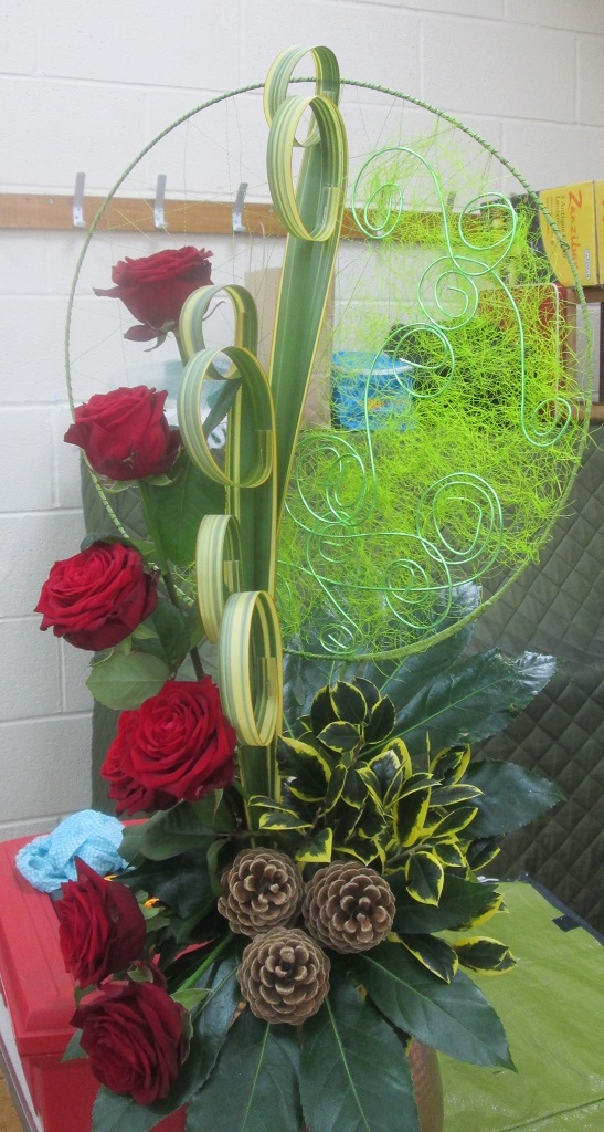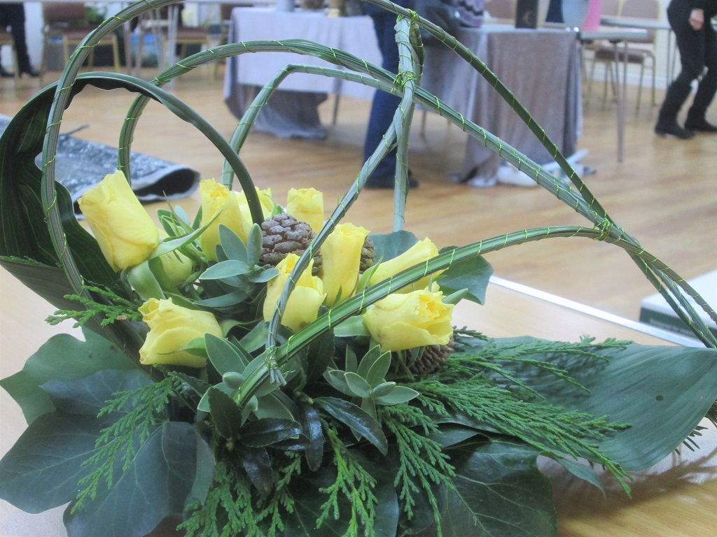 A wide variety of flowers and foliage were used; this included lime green griselinia, pittosporum, black thai leaves, a variety of viburnums, chaenomeles, eucalyptus, papyrus, photinia, spiraea, arum italicum together with anastasia chrysanthemums, tulips, ornithogalum, roses, carnations, stocks, hydrangea, anthuriums and cymbidium orchids. Many of us were very envious of the amount of garden material Julie had managed to pick from her own garden.